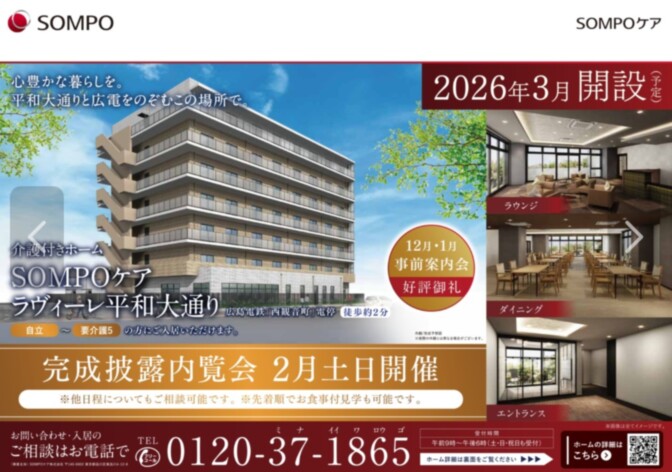 〒730‒0051 広島県広島市中区大手町3-11-20 (SOMPOケア ラヴィーレ平和公園併設) |