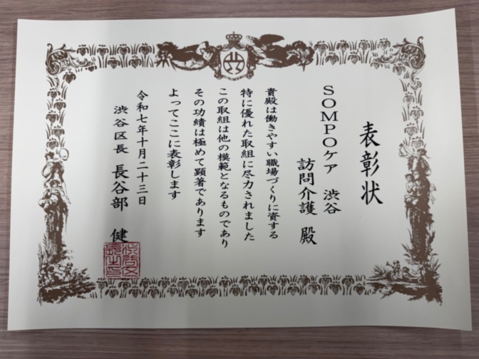なんと、SOMPOケア渋谷が渋谷区の優良事業所表彰で見事表彰されました!!!